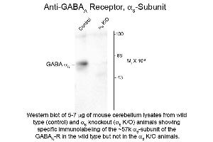 Anti-GABA(A) Receptor alpha 6 (Rabbit) antibody is tested for use in Western Blotting. Specific conditions for reactivity should be optimized by the end user. Expect a band of approximately 57 kDa in size corresponding to the alpha 6 subunit of the GABA(A) receptor in the appropriate cell lysate or extract.