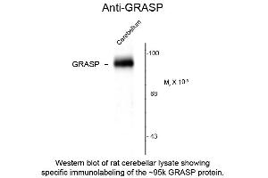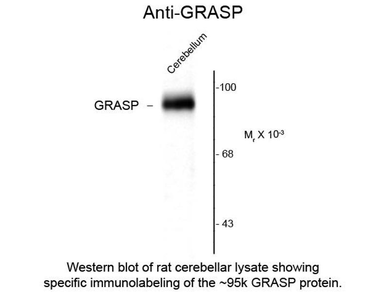 Anti-GRASP (Rabbit) antibody is tested for use in Western Blotting. Specific conditions for reactivity should be optimized by the end user. Expect a band of approximately 95 kDa in size corresponding to GRASP protein in the appropriate cell lysate or extract.