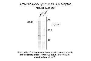 Anti-NMDA R2B pY1252 Antibody is tested for use in Western Blotting and IHC. Expect a band of approximately 180 kDa in size corresponding to NMDAR NR2B subunit protein phosphorylated at Tyr1252 in the appropriate cell lysate or extract. Specific conditions for reactivity should be optimized by the end user.