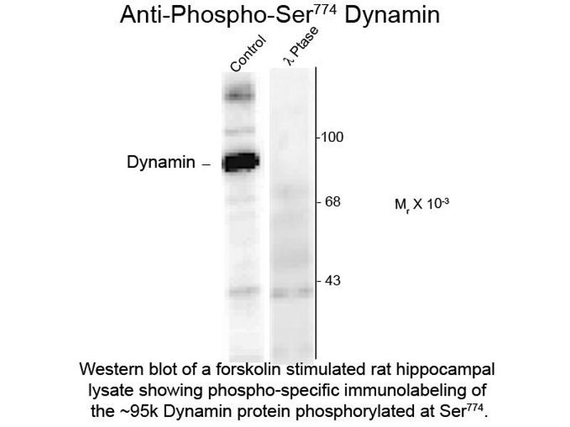 - Anti-Dynamin pS774 Antibody was produced in sheep by repeated immunizations with synthetic phospho-peptide corresponding to amino acid residues surrounding Ser774 conjugated to KLH.