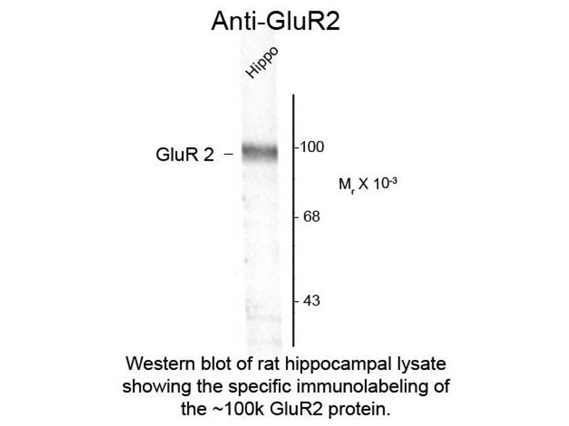 Anti-GluR2 (Rabbit) antibody is tested for use in Western Blotting. Specific conditions for reactivity should be optimized by the end user. Expect a band of approximately 100 kDa in size corresponding to GluR2 protein in the appropriate cell lysate or extract.