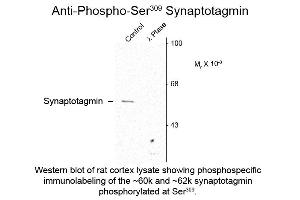 Anti-Synaptotagmin pS309 antibody is tested for use in Western Blotting and IHC. Expect a band of approximately 60-62 kDa in size corresponding to synaptotagmin protein phosphorylated at Ser309 in the appropriate cell lysate or extract. Researchers should determine optimal titers for applications that are not stated below.