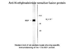 Anti-NSF Antibody is tested for use in Western Blotting. Specific conditions for reactivity should be optimized by the end user. Expect a band of approximately 75 kDa in size corresponding to the NSF protein in the appropriate cell lysate or extract.