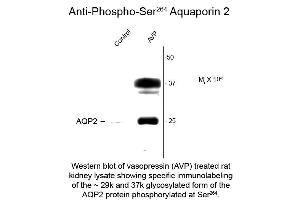 Anti-Aquaporin 2 pS264 antibody is tested for use in ELISA, Western Blotting. Specific conditions for reactivity should be optimized by the end user. Expect a band of approximately 29 kDa in size corresponding to AQP2 protein phosphorylated at Ser264 in the appropriate cell lysate or extract. This antibody also recognizes the glycosylated form of aquaporin 2 protein at approximately 37 kDa in size.