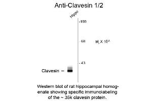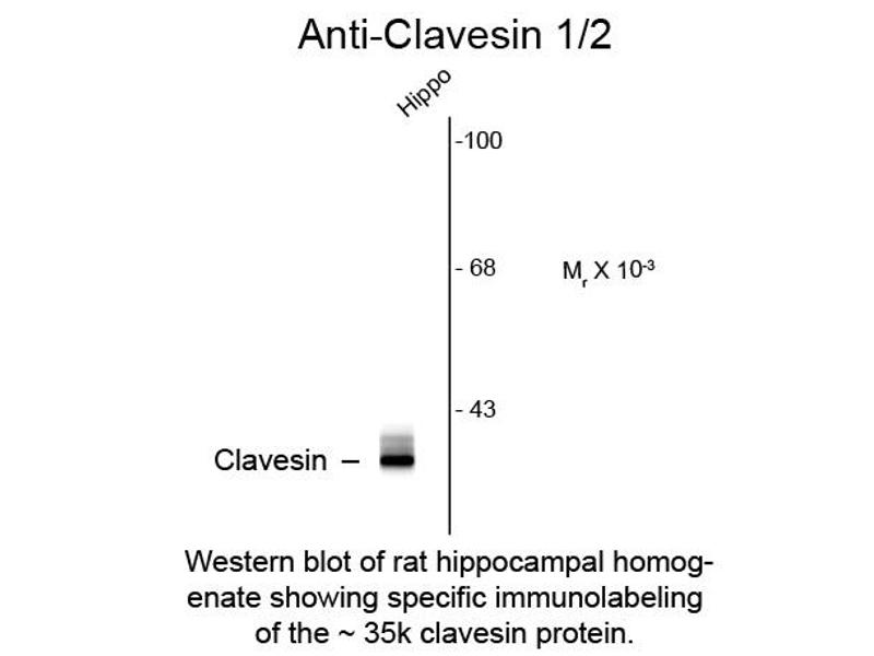 Anti-Clavesin antibody is tested for use in ELISA, Western Blotting and ICC. Specific conditions for reactivity should be optimized by the end user. Expect a band of approximately 35 kDa in size corresponding to clavesin protein doublet in Western Blots of rat brain lysate. Isoform-specific knock down in cultured hippocampal neurons indicates that the lower and upper bands are clavesin 1 and 2, respectively.