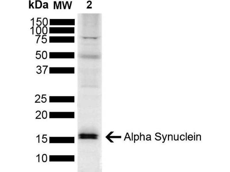 A 1:1000 dilution of ABIN6698748 was sufficient for detection of Alpha Synuclein in 15 μg of mouse Brain cell lysates by ECL immunoblot analysis using goat anti-rabbit IgG:HRP as the secondary antibody.