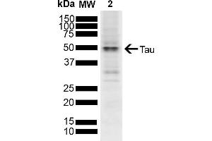 A 1:1000 dilution of ABIN6698775 was sufficient for detection of Tau in 10 μg of human SH-SY5Y cell lysate cell lysates by ECL immunoblot analysis using goat anti-rabbit IgG:HRP as the secondary antibody.