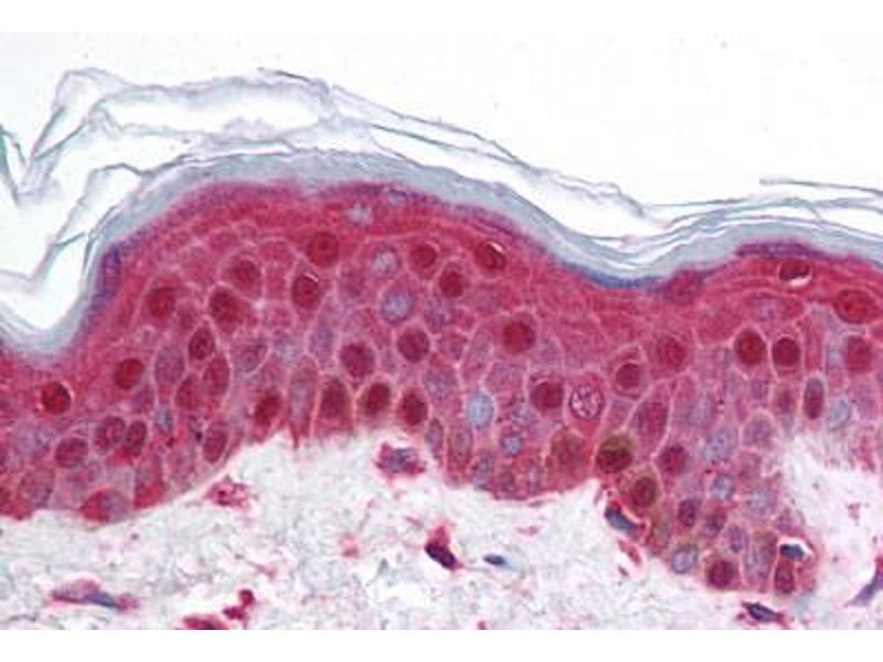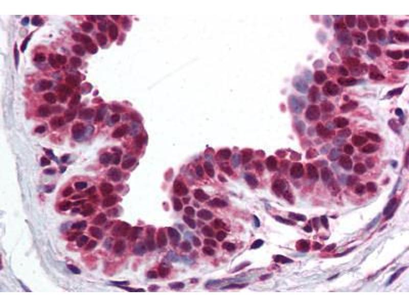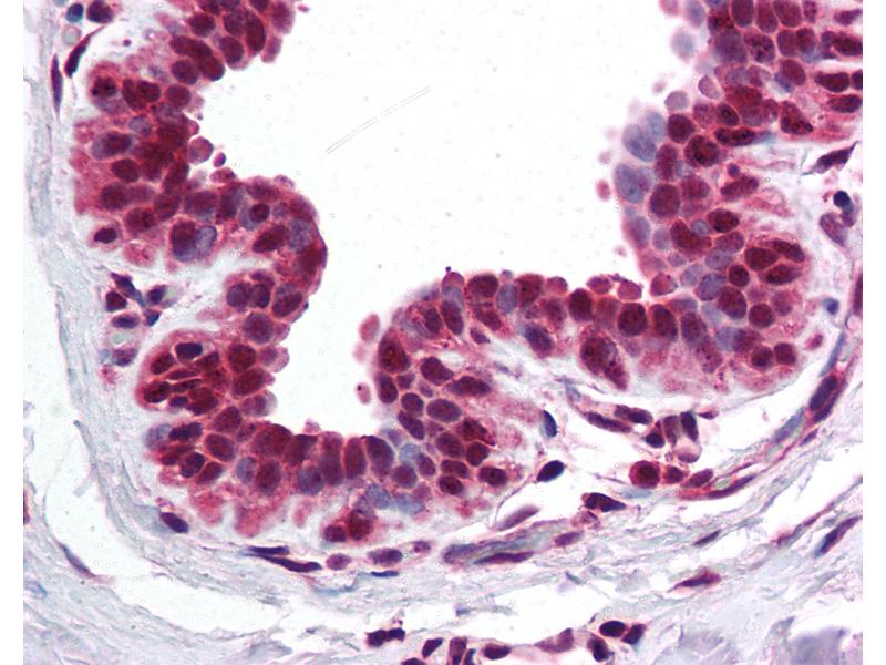 Usage: Immunohistochemistry: This antibody was validated for use in immunohistochemistry on a panel of 21 formalin-fixed, paraffin-embedded (FFPE) human tissues after heat induced antigen retrieval in pH 6.0 citrate buffer. After incubation with the primary antibody, slides were incubated with biotinylated secondary antibody, followed by alkaline phosphatase-streptavidin and chromogen. The stained slides were evaluated by a pathologist to confirm staining specificity. The optimal working concentration for this antibody was determined to be 5 μg/mL. -