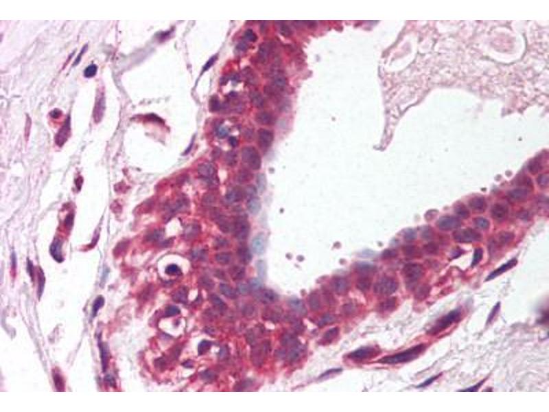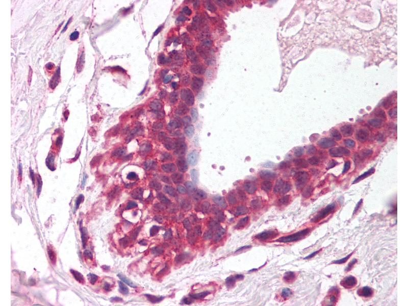 Usage: Immunohistochemistry: This antibody was validated for use in immunohistochemistry on a panel of 21 formalin-fixed, paraffin-embedded (FFPE) human tissues after heat induced antigen retrieval in pH 6.0 citrate buffer. After incubation with the primary antibody, slides were incubated with biotinylated secondary antibody, followed by alkaline phosphatase-streptavidin and chromogen. The stained slides were evaluated by a pathologist to confirm staining specificity. The optimal working concentration for this antibody was determined to be 5 μg/mL. -