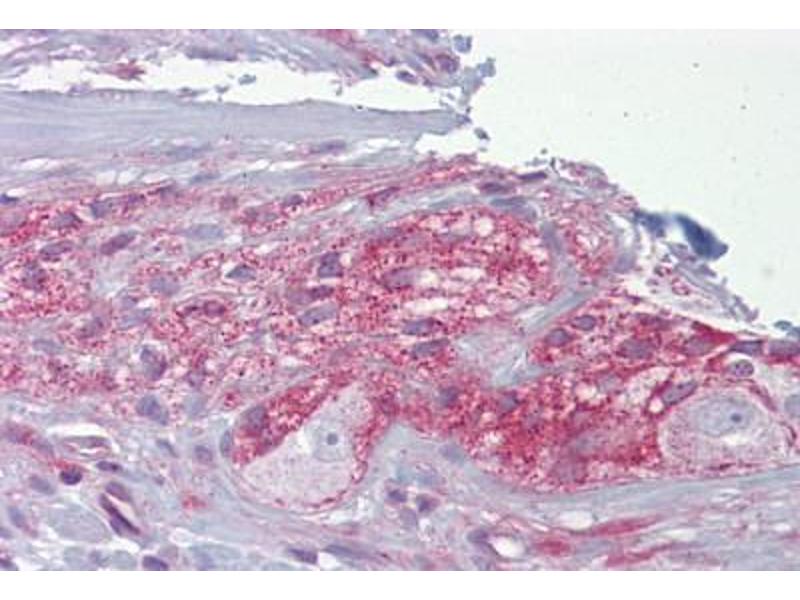Synthetic peptide from C-Terminus of human NCS1 (P62166, NP_055101). Percent identity by BLAST analysis: Human, Chimpanzee, Gorilla, Orangutan, Gibbon, Galago, Marmoset, Mouse, Rat, Elephant, Dog, Bovine, Bat, Horse, Pig, Opossum, Guinea pig, Turkey, Zebra finch, Chicken, Platypus, Xenopus, Stickleback, Pufferfish, Zebrafish (100%), Salmon (92%), Drosophila (85%), Beetle (84%).