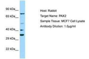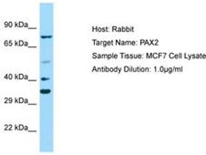 Synthetic peptide located between aa180-229 of human PAX2 (G3V5U4, NP_000269). Percent identity by BLAST analysis: Human, Chimpanzee, Gorilla, Orangutan, Gibbon, Monkey, Galago, Marmoset, Sheep, Elephant, Panda, Dog, Bovine, Bat, Rabbit, Horse, Pig, Opossum, Guinea pig, Turkey, Zebra finch, Chicken, Zebrafish (100%), Mouse, Rat, Lizard, Xenopus, Seabass (92%), Medaka (85%).