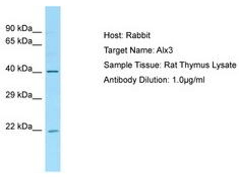 Synthetic peptide located between aa51-100 of rat Alx3 (Q6RW14, NP_001007013). Percent identity by BLAST analysis: Human, Chimpanzee, Gorilla, Rat, Elephant, Panda, Bat, Rabbit (100%), Orangutan, Gibbon, Monkey, Marmoset, Mouse, Horse, Guinea pig (92%), Galago, Hamster (85%).