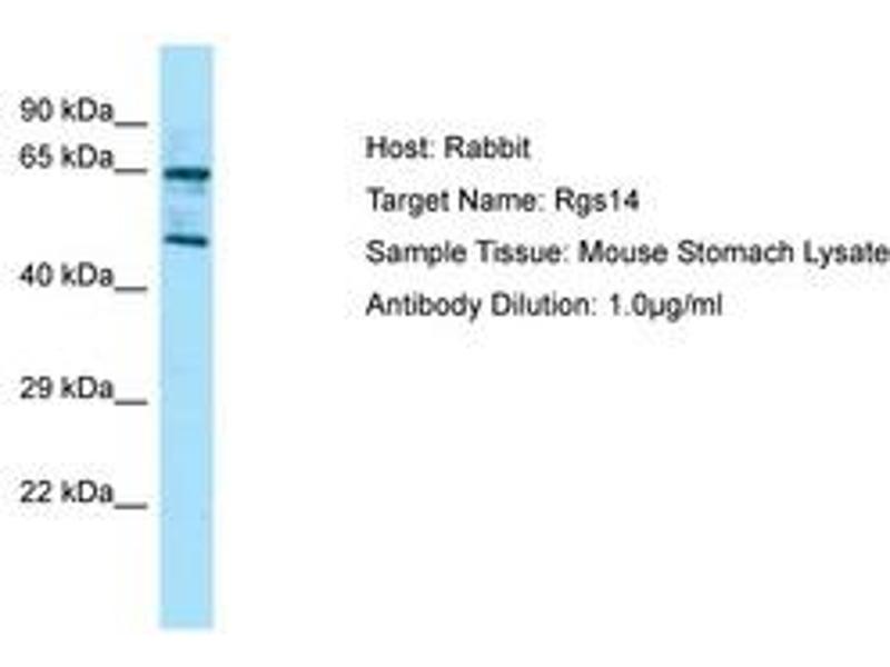 Synthetic peptide located between aa201-250 of mouse Rgs14 (P97492, NP_058038). Percent identity by BLAST analysis: Human, Chimpanzee, Gorilla, Orangutan, Gibbon, Monkey, Marmoset, Mouse, Elephant, Bat (100%), Galago, Panda, Dog, Bovine, Rabbit, Pig, Guinea pig (92%), Rat (85%).