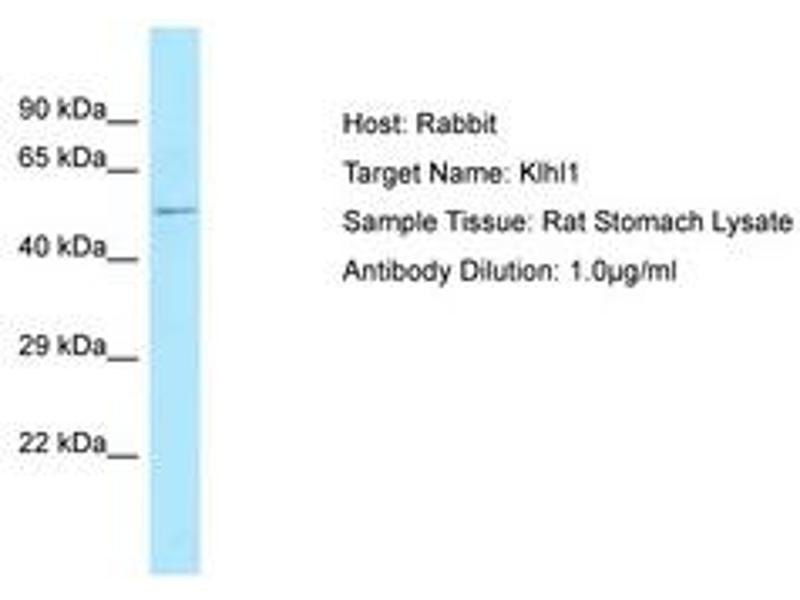 Synthetic peptide located between aa72-121 of rat Klhl1 (D4A9J8, NP_001099524). Percent identity by BLAST analysis: Human, Chimpanzee, Gorilla, Orangutan, Gibbon, Monkey, Mouse, Rat, Panda, Rabbit (100%), Marmoset, Horse (92%), Elephant (85%).