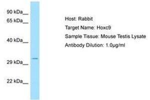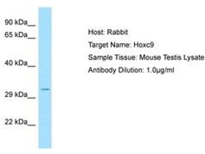 Synthetic peptide from C-Terminus of mouse Hoxc9 (P09633, NP_032298). Percent identity by BLAST analysis: Human, Chimpanzee, Gorilla, Orangutan, Gibbon, Monkey, Galago, Marmoset, Mouse, Rat, Sheep, Goat, Elephant, Panda, Bovine, Bat, Rabbit, Horse, Opossum, Chicken (100%), Xenopus (92%), Salmon (90%), Pufferfish, Zebrafish (86%), Zebra finch (85%), Stickleback, Medaka (80%).