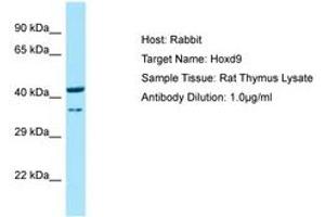 Synthetic peptide from N-Terminus of rat Hoxd9 (B5DFK3, NP_001166940). Percent identity by BLAST analysis: Human, Chimpanzee, Gorilla, Gibbon, Rat, Bovine, Pig, Guinea pig (100%), Orangutan, Mouse, Elephant, Horse (92%), Galago, Rabbit (85%).