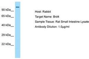 Synthetic peptide from N-Terminus of rat Brd4 (NP_001094373). Percent identity by BLAST analysis: Human, Chimpanzee, Gorilla, Orangutan, Gibbon, Monkey, Galago, Marmoset, Mouse, Rat, Rabbit, Opossum, Guinea pig, Platypus (100%), Panda, Dog, Bovine, Bat, Pig (92%), Horse (85%), Lizard (84%).