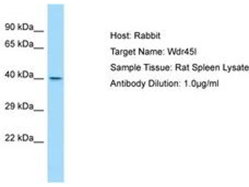 Synthetic peptide from C-Terminus of rat Wdr45b (Q2MCP5, NP_001034676). Percent identity by BLAST analysis: Human, Chimpanzee, Gorilla, Orangutan, Monkey, Galago, Marmoset, Mouse, Rat, Elephant, Panda, Dog, Bovine, Bat, Rabbit, Horse, Pig, Opossum, Guinea pig, Turkey, Zebra finch, Chicken, Lizard, Xenopus (100%), Stickleback, Medaka, Pufferfish, Zebrafish (92%).