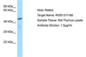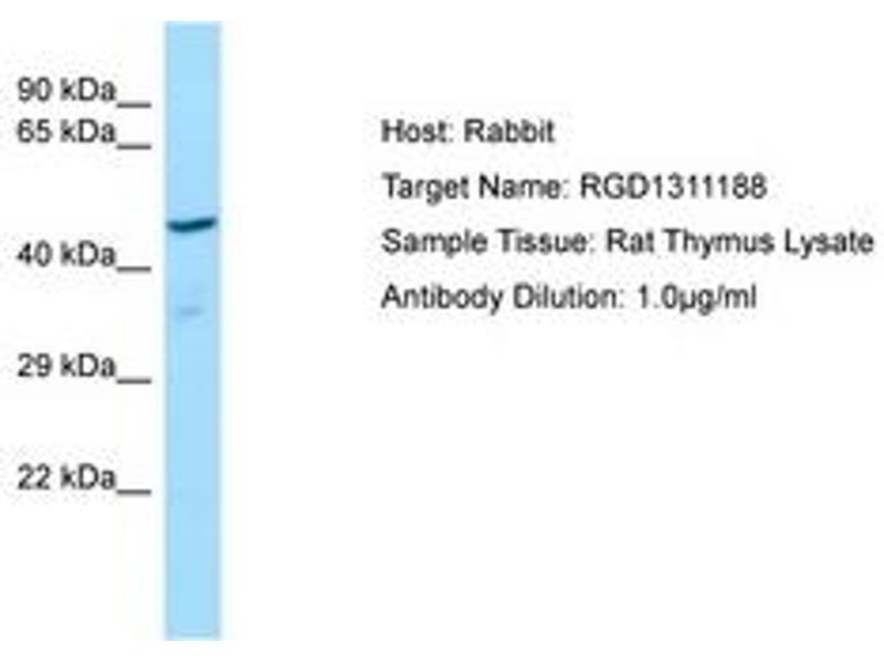 Synthetic peptide located between aa51-100 of rat RGD1311188 (B1WC62, NP_001129369). Percent identity by BLAST analysis: Human, Chimpanzee, Gorilla, Orangutan, Gibbon, Monkey, Marmoset, Rat, Panda, Pig (100%), Galago, Dog, Bovine, Bat, Horse, Opossum (92%).