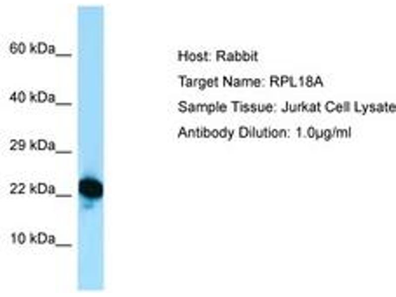 Synthetic peptide from C-Terminus of human RPL18A (Q02543, NP_000971). Percent identity by BLAST analysis: Human, Chimpanzee, Gorilla, Orangutan, Gibbon, Monkey, Galago, Marmoset, Mouse, Rat, Elephant, Panda, Dog, Bovine, Bat, Horse, Pig, Opossum, Guinea pig, Turkey, Zebra finch, Chicken, Platypus, Lizard, Xenopus, Frog, Salmon, Stickleback, Pufferfish, Zebrafish (100%), Medaka (92%), Rabbit, Catfish (85%).