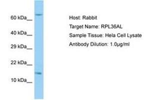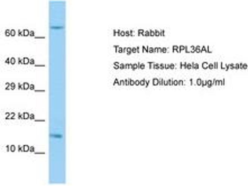 Synthetic peptide from C-Terminus of human RPL36AL (Q969Q0, NP_000992). Percent identity by BLAST analysis: Human, Chimpanzee, Mouse, Rat, Bovine, Rabbit, Horse, Pig, Guinea pig (100%).