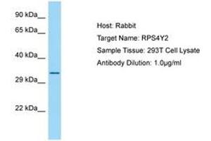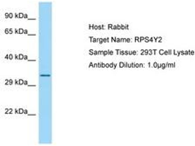 Synthetic peptide located between aa166-215 of human RPS4Y2 (Q8TD47, NP_001034656). Percent identity by BLAST analysis: Human, Chimpanzee, Gorilla, Orangutan, Gibbon, Baboon, Monkey, Galago, Marmoset, Mouse, Rat, Goat, Hamster, Elephant, Panda, Dog, Cat, Bovine, Horse, Pig, Guinea pig, Turkey, Zebra finch, Chicken, Platypus, Lizard, Xenopus, Catfish, Stickleback, Medaka, Pufferfish (100%), Bat, Opossum, Trout, Salmon, Pike, Zebrafish, Tick (91%).