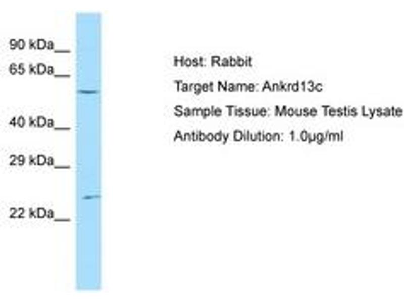 Synthetic peptide located between aa401-450 of mouse Ankrd13c (Q3UX43, NP_001013828). Percent identity by BLAST analysis: Mouse (100%).