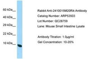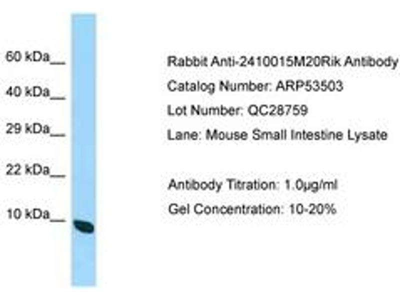 Synthetic peptide located between aa63-112 of mouse 2410015M20Rik (Q8R404, NP_694792). Percent identity by BLAST analysis: Human, Chimpanzee, Gorilla, Orangutan, Monkey, Mouse, Panda, Pig (100%), Gibbon, Galago, Marmoset, Horse (92%), Dog, Bovine, Bat, Guinea pig (85%).