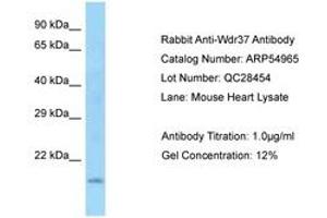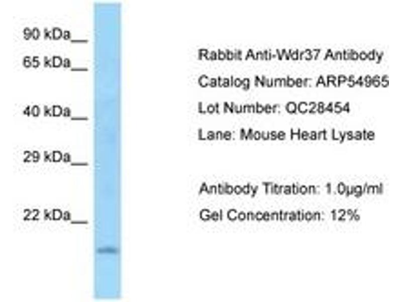 Synthetic peptide from N-Terminus of mouse Wdr37 (Q05BF4, NP_001034478). Percent identity by BLAST analysis: Human, Chimpanzee, Gorilla, Orangutan, Gibbon, Monkey, Galago, Marmoset, Mouse, Rat, Elephant, Bovine, Bat, Rabbit, Horse, Opossum, Guinea pig, Turkey, Zebra finch, Chicken, Platypus, Lizard (100%), Salmon (92%), Xenopus, Zebrafish (85%).