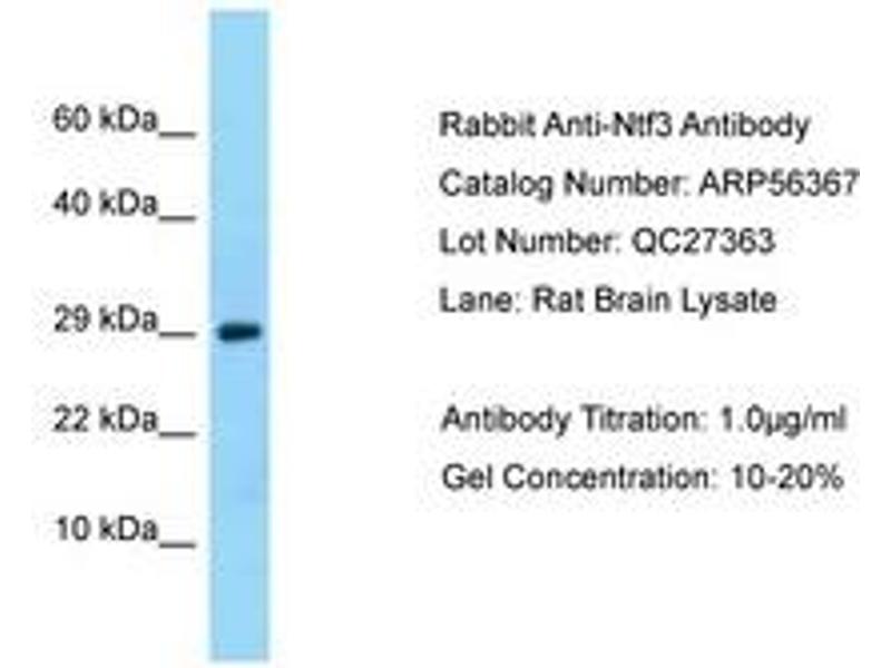 Synthetic peptide located between aa23-72 of rat Ntf3 (P18280, NP_112335). Percent identity by BLAST analysis: Human, Chimpanzee, Gorilla, Gibbon, Mouse, Rat, Elephant, Panda, Cat, Bovine, Bat, Rabbit, Horse, Guinea pig (100%), Dog, Pig, Chicken, Lizard (92%).