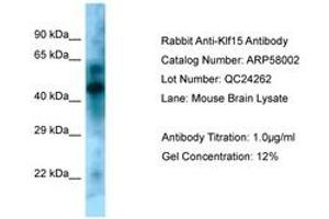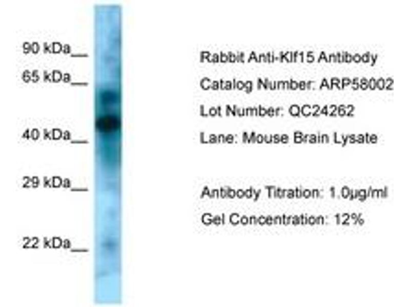 Synthetic peptide from N-Terminus of mouse Klf15 (Q9EPW2, NP_075673). Percent identity by BLAST analysis: Human, Chimpanzee, Gorilla, Orangutan, Monkey, Galago, Mouse, Elephant, Panda, Bat (100%), Marmoset, Rat, Dog, Pig, Guinea pig (92%), Bovine (91%), Horse (90%), Zebra finch, Lizard (83%).