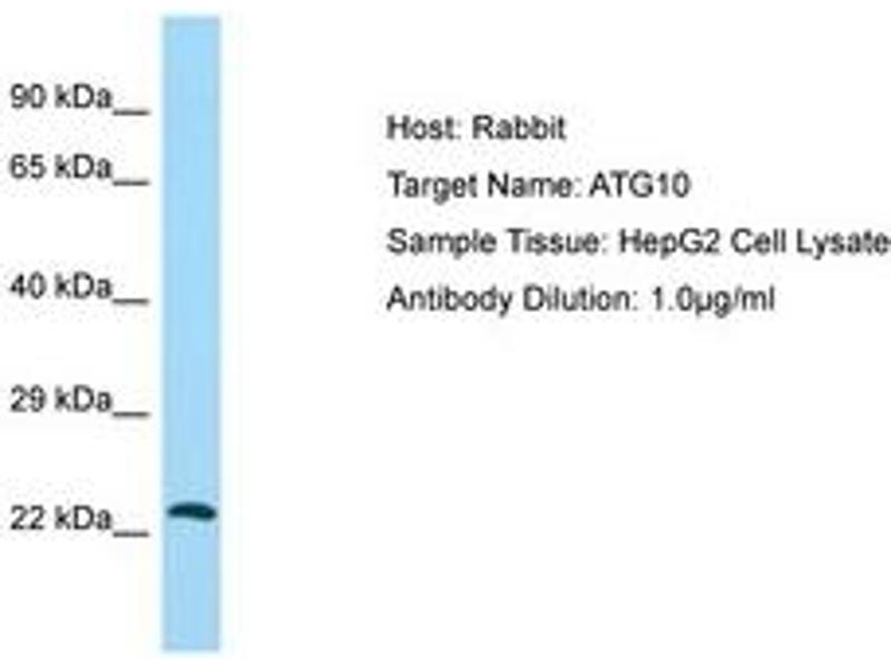 Synthetic peptide from C-Terminus of human ATG10 (Q9H0Y0, NP_001124500). Percent identity by BLAST analysis: Human, Chimpanzee, Gorilla, Orangutan, Gibbon, Marmoset, Elephant, Dog, Bat, Rabbit, Horse (100%), Monkey, Galago, Mouse, Rat, Panda, Bovine, Guinea pig (92%), Pufferfish (84%).