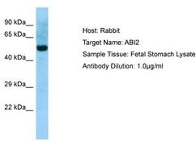 Synthetic peptide from N-Terminus of human ABI2 (Q9NYB9, NP_005750). Percent identity by BLAST analysis: Human, Chimpanzee, Gorilla, Orangutan, Gibbon, Monkey, Galago, Marmoset, Elephant, Panda, Dog, Bovine, Bat, Rabbit, Horse, Opossum, Guinea pig, Turkey, Zebra finch, Chicken (100%), Mouse, Rat, Platypus, Lizard, Xenopus, Pufferfish (92%).