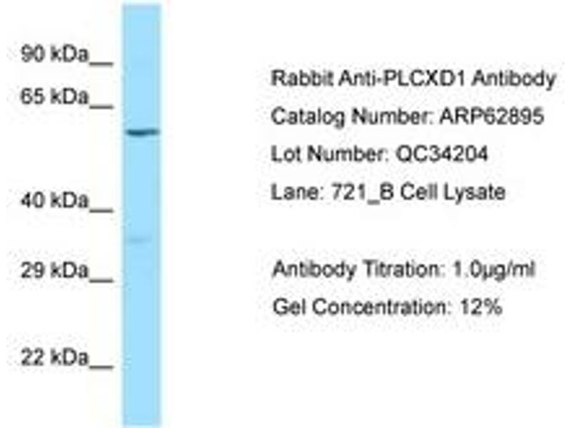 Synthetic peptide located between aa220-269 of human PLCXD1 (Q9NUJ7, NP_060860). Percent identity by BLAST analysis: Human, Chimpanzee, Gorilla, Orangutan, Monkey, Marmoset (100%), Panda, Dog, Rabbit, Horse (92%), Galago, Bovine (85%).