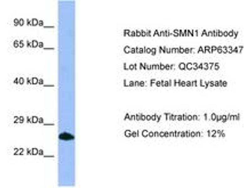 Synthetic peptide from C-Terminus of human SMN1 (Q16637-2, NP_075012). Percent identity by BLAST analysis: Human, Chimpanzee, Gorilla, Orangutan, Gibbon, Monkey, Marmoset, Pig (100%), Panda, Dog, Cat, Horse, Guinea pig (92%), Mouse (84%), Rat (78%).