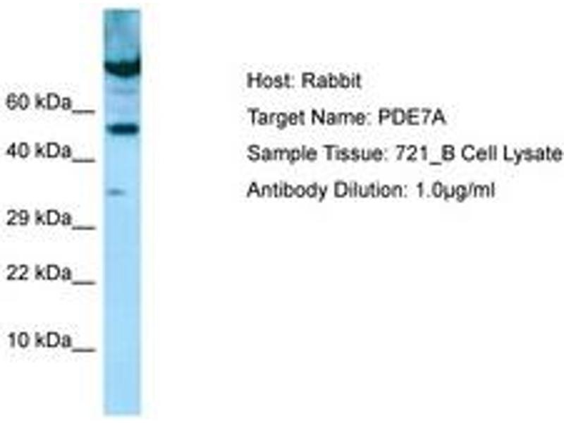 Synthetic peptide located between aa338-387 of human PDE7A (Q13946, NP_001229247). Percent identity by BLAST analysis: Human, Chimpanzee, Gorilla, Orangutan, Gibbon, Monkey, Galago, Marmoset, Mouse, Rat, Elephant, Panda, Dog, Bovine, Bat, Rabbit, Horse, Pig, Opossum, Guinea pig, Turkey, Zebra finch, Chicken, Platypus, Lizard, Xenopus, Seabass, Stickleback, Pufferfish, Zebrafish (100%), Medaka (92%).