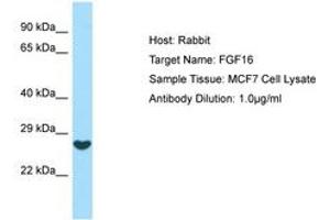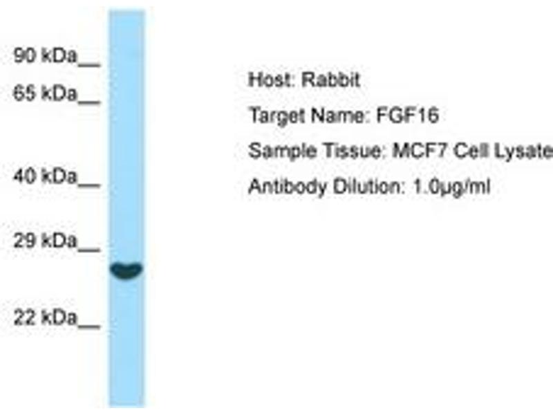 Synthetic peptide located between aa136-185 of human FGF16 (O43320, NP_003859). Percent identity by BLAST analysis: Human, Chimpanzee, Gorilla, Orangutan, Gibbon, Galago, Marmoset, Mouse, Rat, Elephant, Dog, Bovine, Bat, Rabbit, Horse, Pig, Guinea pig, Turkey, Zebra finch, Chicken (100%), Opossum, Lizard, Xenopus, Stickleback, Medaka, Pufferfish, Zebrafish (92%), Monkey, Panda, Platypus (85%).