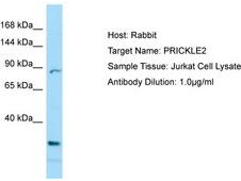 Synthetic peptide from C-Terminus of human PRICKLE2 (Q7Z3G6, NP_942559). Percent identity by BLAST analysis: Human, Chimpanzee, Gorilla, Orangutan, Gibbon, Monkey, Galago, Marmoset, Mouse, Rat, Elephant, Panda, Dog, Bovine, Bat, Rabbit, Horse, Pig, Opossum, Guinea pig, Turkey, Zebra finch, Chicken, Platypus, Lizard (100%), Xenopus (92%), Seabass, Zebrafish (85%).