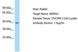 Synthetic peptide from C-Terminus of human NDRG3 (Q9UGV2, NP_071922). Percent identity by BLAST analysis: Human, Chimpanzee, Gorilla, Orangutan, Gibbon, Monkey, Marmoset, Mouse, Rat, Rabbit (100%), Galago, Panda, Dog, Bovine, Bat, Guinea pig (92%), Horse (85%).