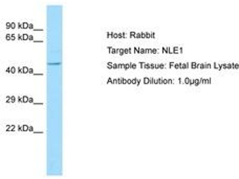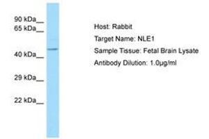 Synthetic peptide from C-Terminus of human NLE1 (Q9NVX2, NP_060566). Percent identity by BLAST analysis: Human, Chimpanzee, Gorilla, Orangutan, Gibbon, Monkey, Galago, Marmoset, Mouse, Rat, Elephant, Dog, Bovine, Bat, Rabbit, Horse, Pig, Opossum, Guinea pig, Turkey, Zebra finch, Chicken, Xenopus, Stickleback, Medaka, Pufferfish, Zebrafish (100%), Panda, Salmon (92%).