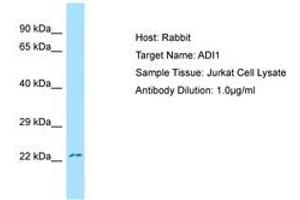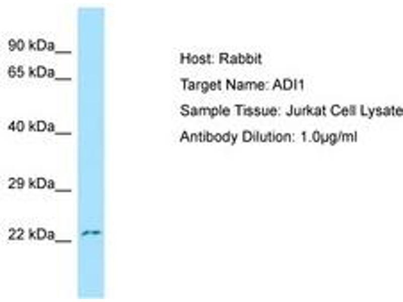Synthetic peptide from N-Terminus of human ADI1 (Q9BV57, NP_060739). Percent identity by BLAST analysis: Human, Chimpanzee, Gorilla, Orangutan, Gibbon, Monkey, Galago, Marmoset, Mouse, Rat, Elephant, Panda, Bovine, Horse (100%), Dog, Rabbit, Opossum (92%), Guinea pig (83%).