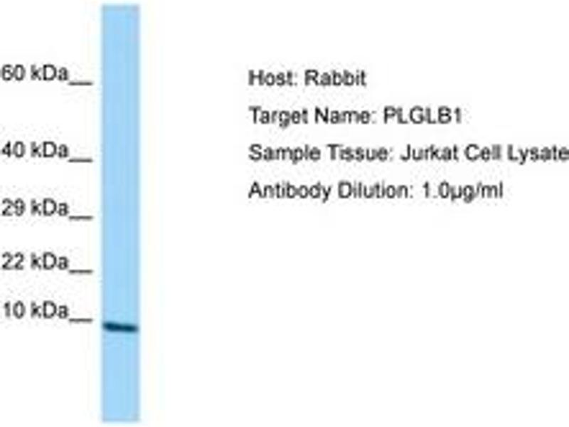 Synthetic peptide located between aa38-87 of human PLGLB1 (Q02325, NP_001027564). Percent identity by BLAST analysis: Human, Chimpanzee, Gorilla, Orangutan, Monkey, Marmoset, Mouse, Rat, Elephant (100%), Gibbon, Galago, Bovine (92%), Panda, Pig, Guinea pig (85%), Bat (83%).