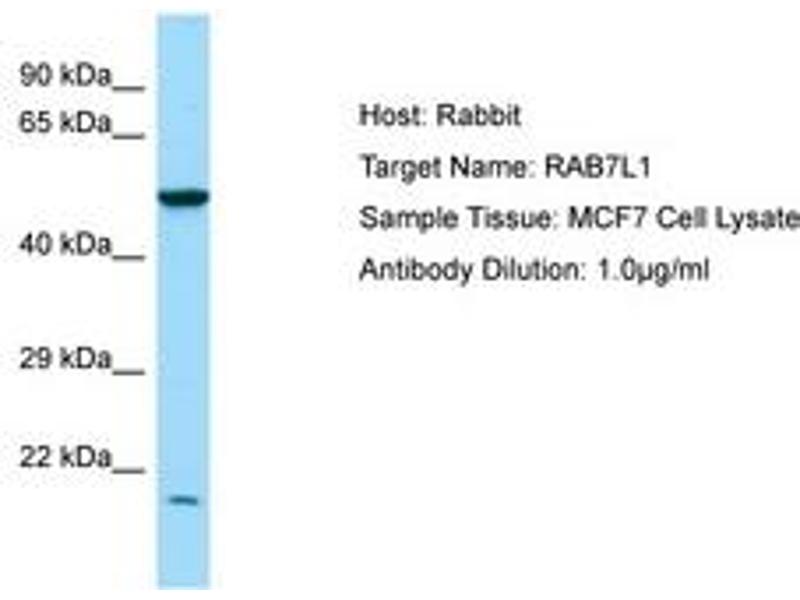 Synthetic peptide from N-Terminus of human RAB7L1 (O14966, NP_001129135). Percent identity by BLAST analysis: Human, Chimpanzee, Gorilla, Orangutan, Gibbon, Monkey, Galago, Marmoset, Mouse, Rat, Elephant, Panda, Bovine, Bat, Rabbit, Horse, Pig (100%), Guinea pig (92%), Dog, Opossum (85%).