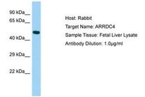 Synthetic peptide from N-Terminus of human ARRDC4 (Q8NCT1, NP_899232). Percent identity by BLAST analysis: Human, Chimpanzee, Orangutan, Gibbon, Monkey, Galago, Panda, Dog, Bovine, Rabbit, Pig, Guinea pig (100%), Marmoset, Mouse, Rat, Elephant (92%).
