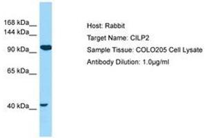 Synthetic peptide located between aa112-161 of human CILP2 (Q8IUL8, NP_694953). Percent identity by BLAST analysis: Human, Chimpanzee, Gorilla, Orangutan, Gibbon, Monkey, Mouse, Rat, Elephant, Dog, Bovine, Bat, Horse, Pig, Guinea pig (100%), Galago (92%), Stickleback (84%).