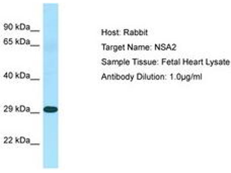 Synthetic peptide from N-Terminus of human NSA2 (O95478, NP_055701). Percent identity by BLAST analysis: Human, Chimpanzee, Gorilla, Gibbon, Monkey, Marmoset, Rat, Elephant, Rabbit, Opossum, Guinea pig, Lizard (100%), Orangutan, Mouse, Panda, Bovine, Bat, Horse, Pig, Platypus, Xenopus, Catfish, Medaka (92%), Turkey, Zebra finch, Chicken, Salmon, Smelt, Pike, Pufferfish, Zebrafish (85%).