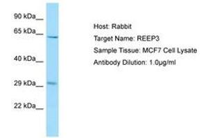 Synthetic peptide located between aa154-203 of human REEP3 (Q6NUK4, NP_001001330). Percent identity by BLAST analysis: Human, Chimpanzee, Gorilla, Orangutan, Marmoset (100%), Gibbon, Monkey, Elephant, Rabbit, Pig (92%), Bat, Horse (85%).