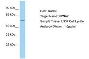 Synthetic peptide located between aa424-473 of human KPNA7 (A9QM74, NP_001139187). Percent identity by BLAST analysis: Human, Chimpanzee, Orangutan, Gibbon (100%), Gorilla, Panda, Dog (92%), Monkey (85%).