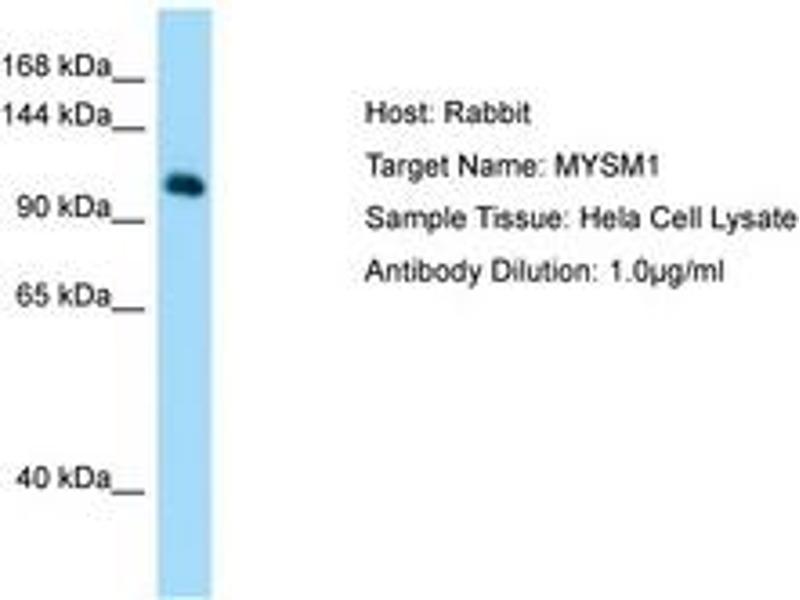 Synthetic peptide located between aa145-194 of human MYSM1 (Q5VVJ2, NP_001078956). Percent identity by BLAST analysis: Human, Chimpanzee, Gorilla, Orangutan, Gibbon (100%), Monkey, Marmoset (85%).