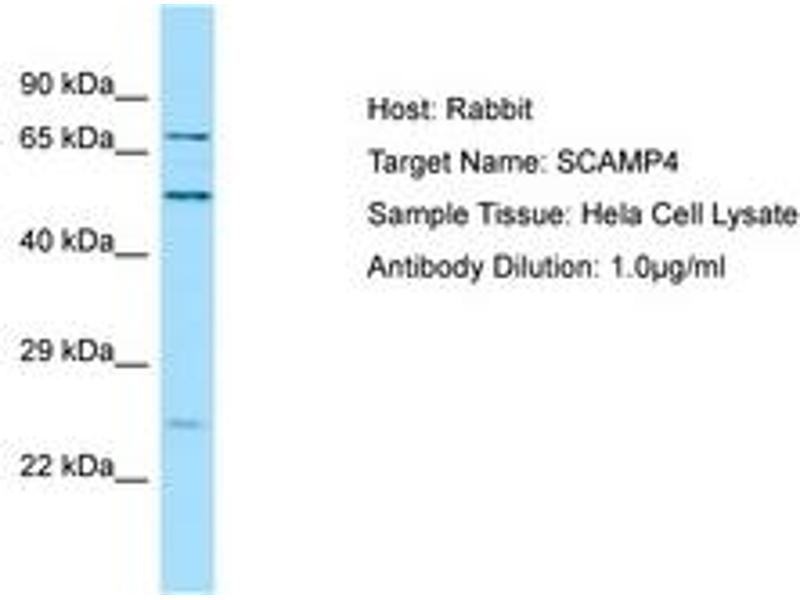 Synthetic peptide from C-Terminus of human SCAMP4 (Q969E2, NP_524558). Percent identity by BLAST analysis: Human, Chimpanzee, Gorilla, Orangutan, Gibbon, Monkey, Galago, Marmoset, Elephant, Panda, Dog, Horse, Pig, Chicken (100%), Bovine, Opossum, Zebra finch (92%), Mouse, Rat, Guinea pig (85%).